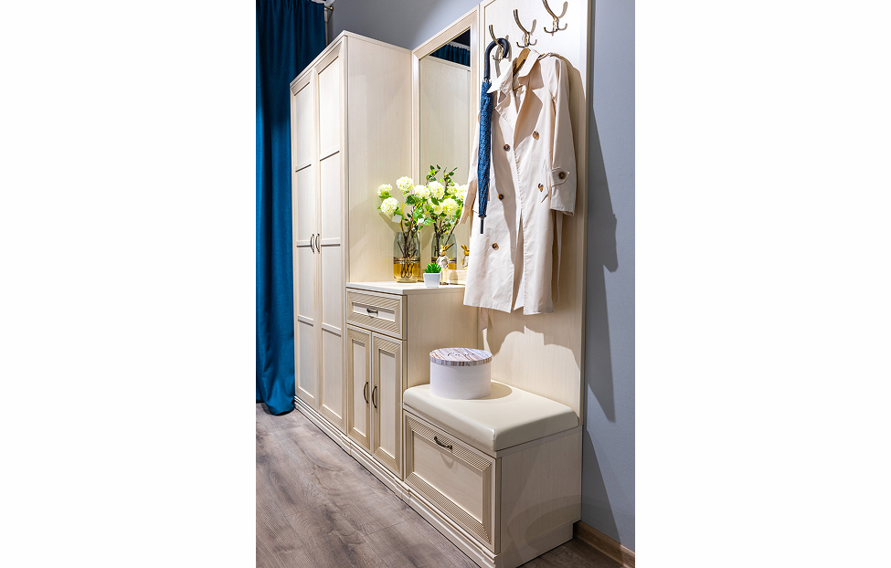 - Вместительный шкаф и вешалки позволят разместить верхнюю одежду, а тумбочки сохранят в чистоте обувь и аксессуары.