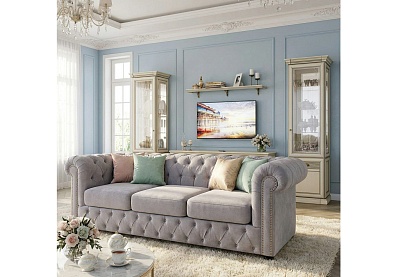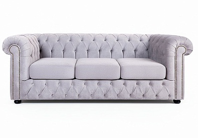 Яркая харизматичная модель украсит интерьер в стиле постмодернизм, ретро, эклектика. Традиционные элементы английской классики — подлокотники в виде свитков, низкая спинка, стяжка «капитоне», декоративные гвоздики — удивительным образом гармонируют с серым оттенком обивки. Качественный мебельный микровельвет обладает изысканной, переливчатой фактурой, неприхотлив в уходе, устойчив к действию солнечного ультрафиолета. Отстрочка выполнена прочной армированной нитью.